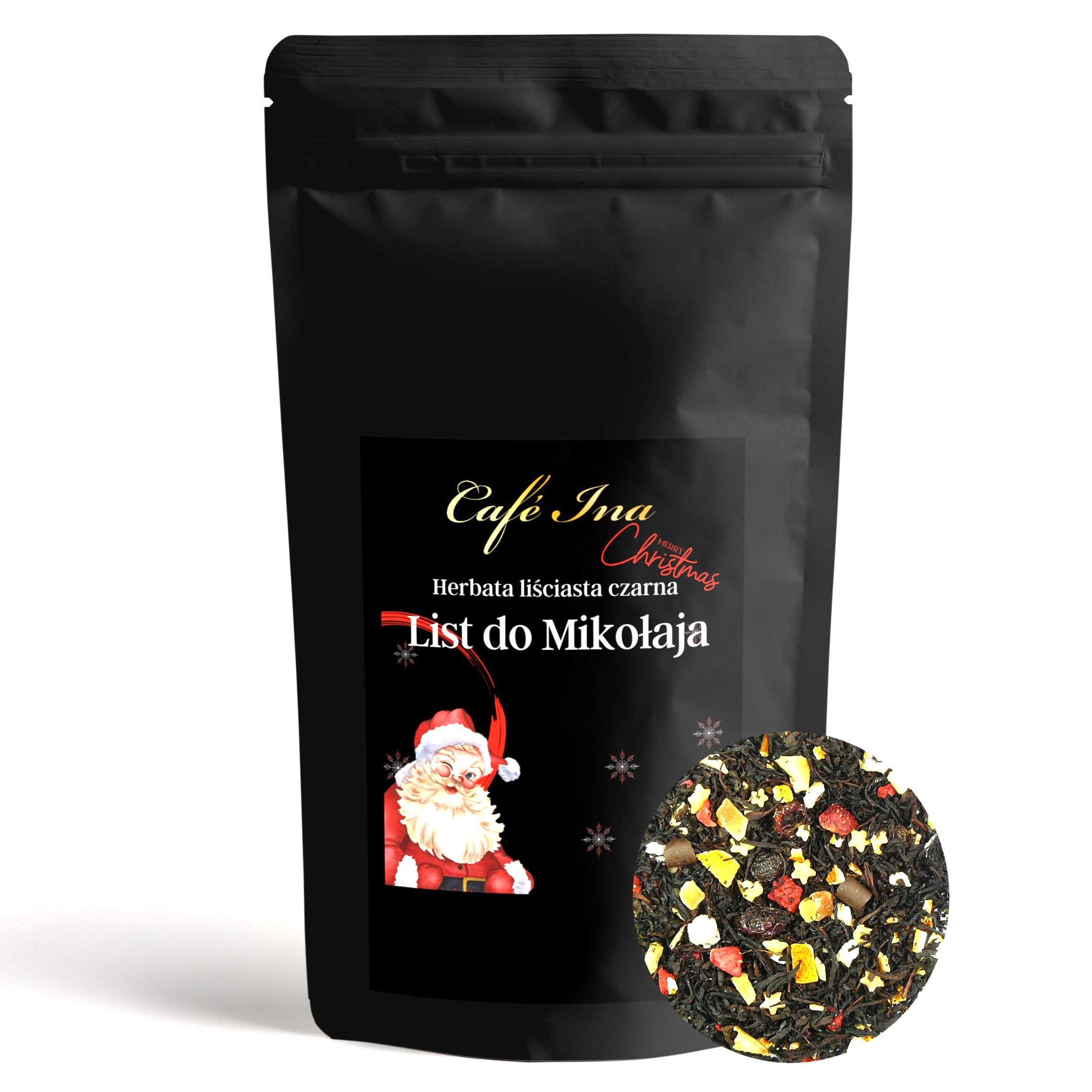 Herbata Czarna List do Świętego Mikołaja to niezwykłe połączenie Czarnej herbaty Ceylon BOP1 z papają, jabłkiem, skórką pomarańczy, dekoracjami cukrowymi, rodzynkami, żurawiną, truskawką oraz płatkami czekolady. List do Świętego Mikołaja to niezwykła czarna herbata stworzona z myślą podkreśleniu świątecznego klimatu panującego w okresie świąt Bożego Narodzenia. Spraw sobie oraz swoim najbliższym niezwykły prezent w postaci wysokiej jakoś herbaty z idealnie dobranymi dodatkami.